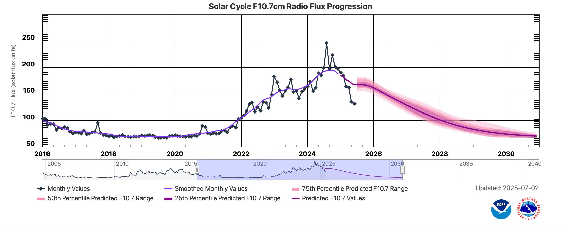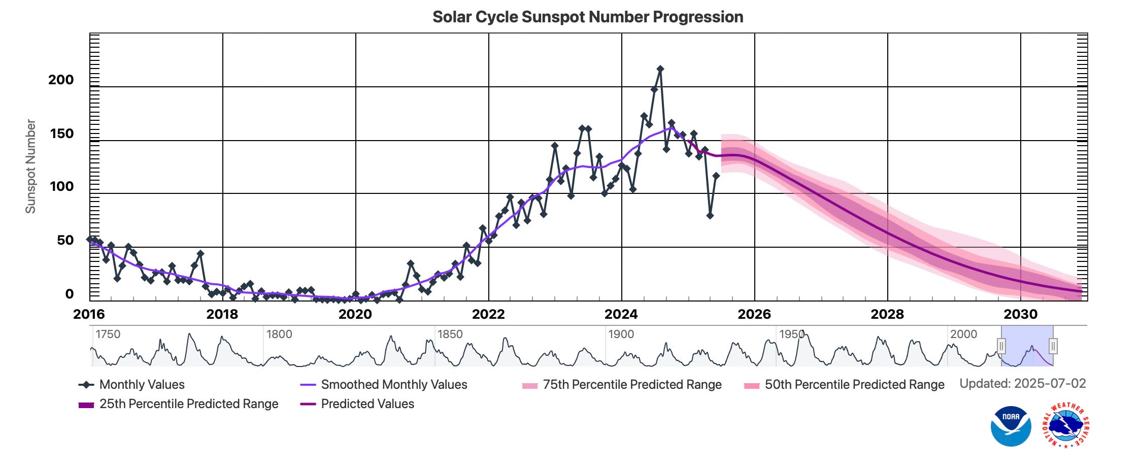 - Sunspot Numbers: Peaking above 160 per month in late 2024, far surpassing the NOAA projection of ~115.