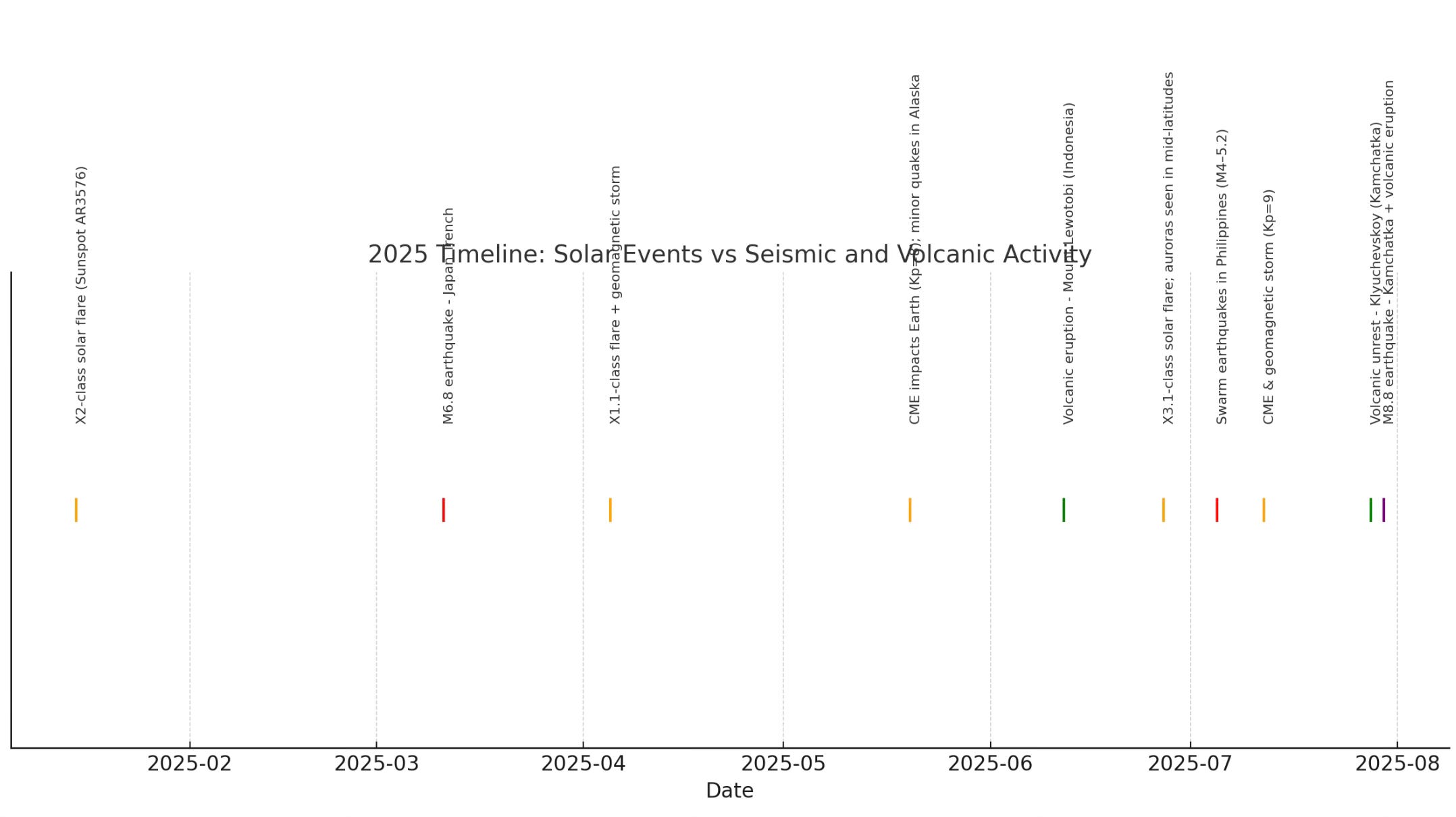 - July 2025: Multiple solar events were recorded just 48–72 hours before the Kamchatka megathrust quake and Klyuchevskoy eruption.